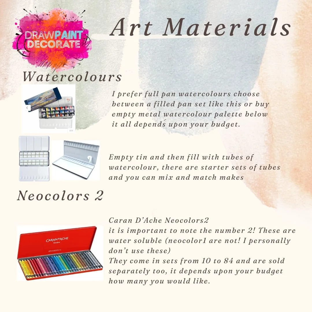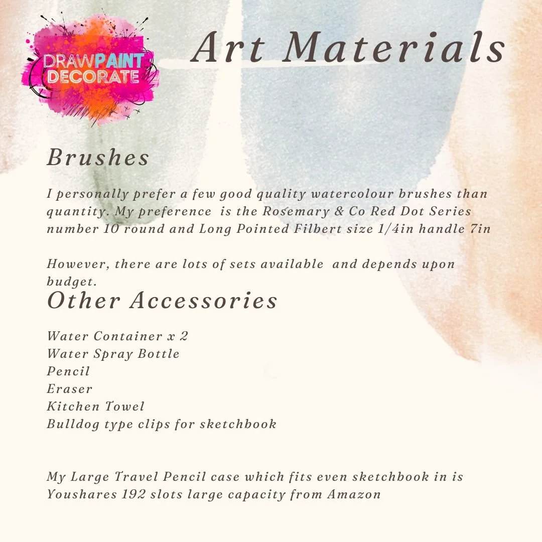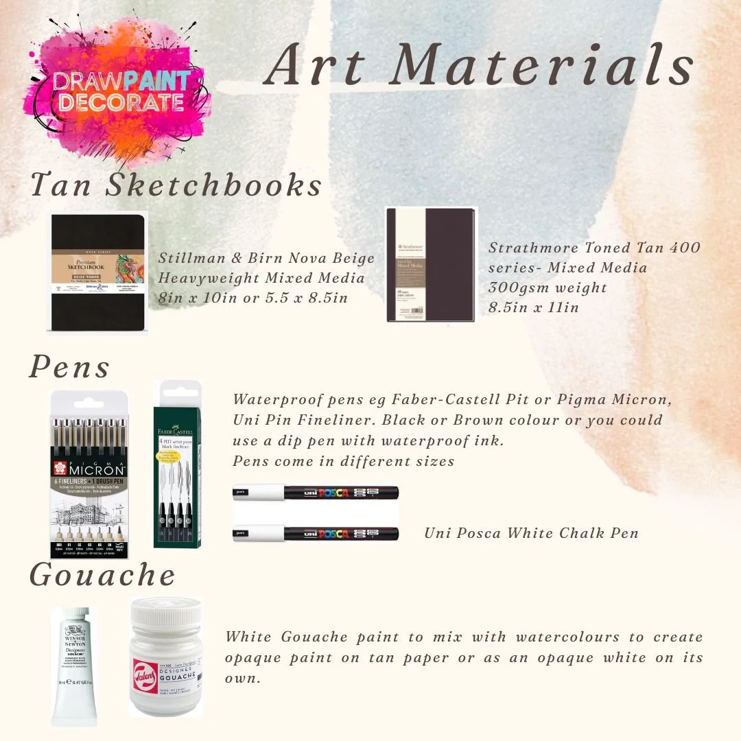 See below for art materials that I use as I get asked, but please use whatever you have. If using white paper just put on a mid wash where my tan paper is! The Key Objective is to have a go, learn and have fun, not to be perfect or exactly the same.