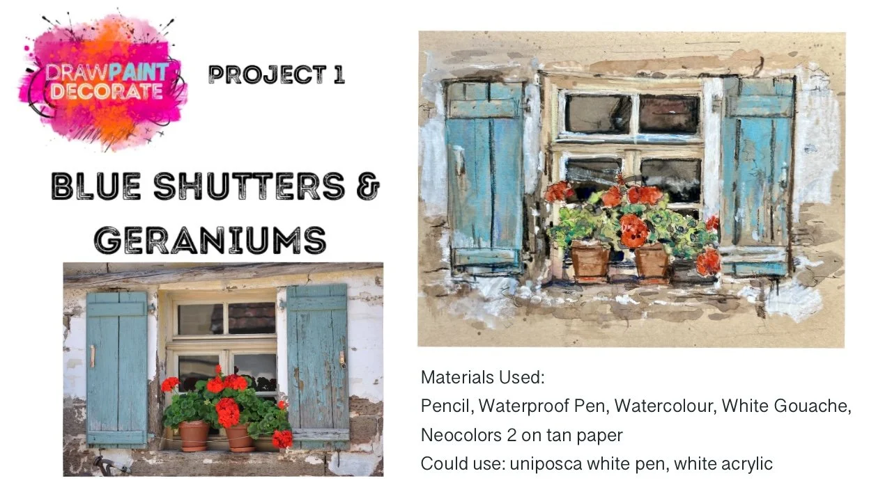 Drawing & Painting is learnt through action not through watching and I think a monthly project is the perfect way to learn! Our first project is Blue Shutters & Geraniums I take you through from beginning to end with this one from Drawing to Painting to Decorating!!